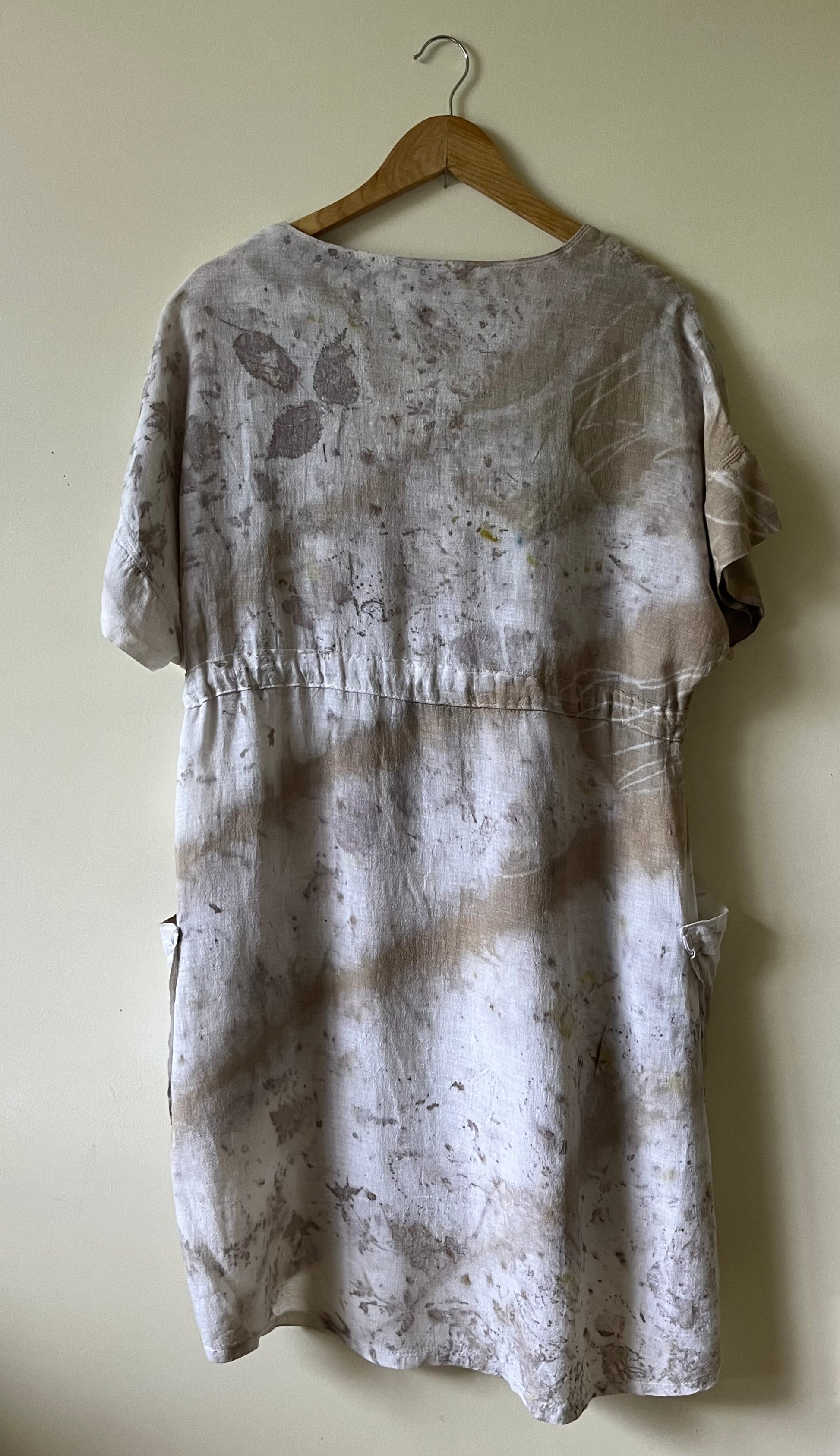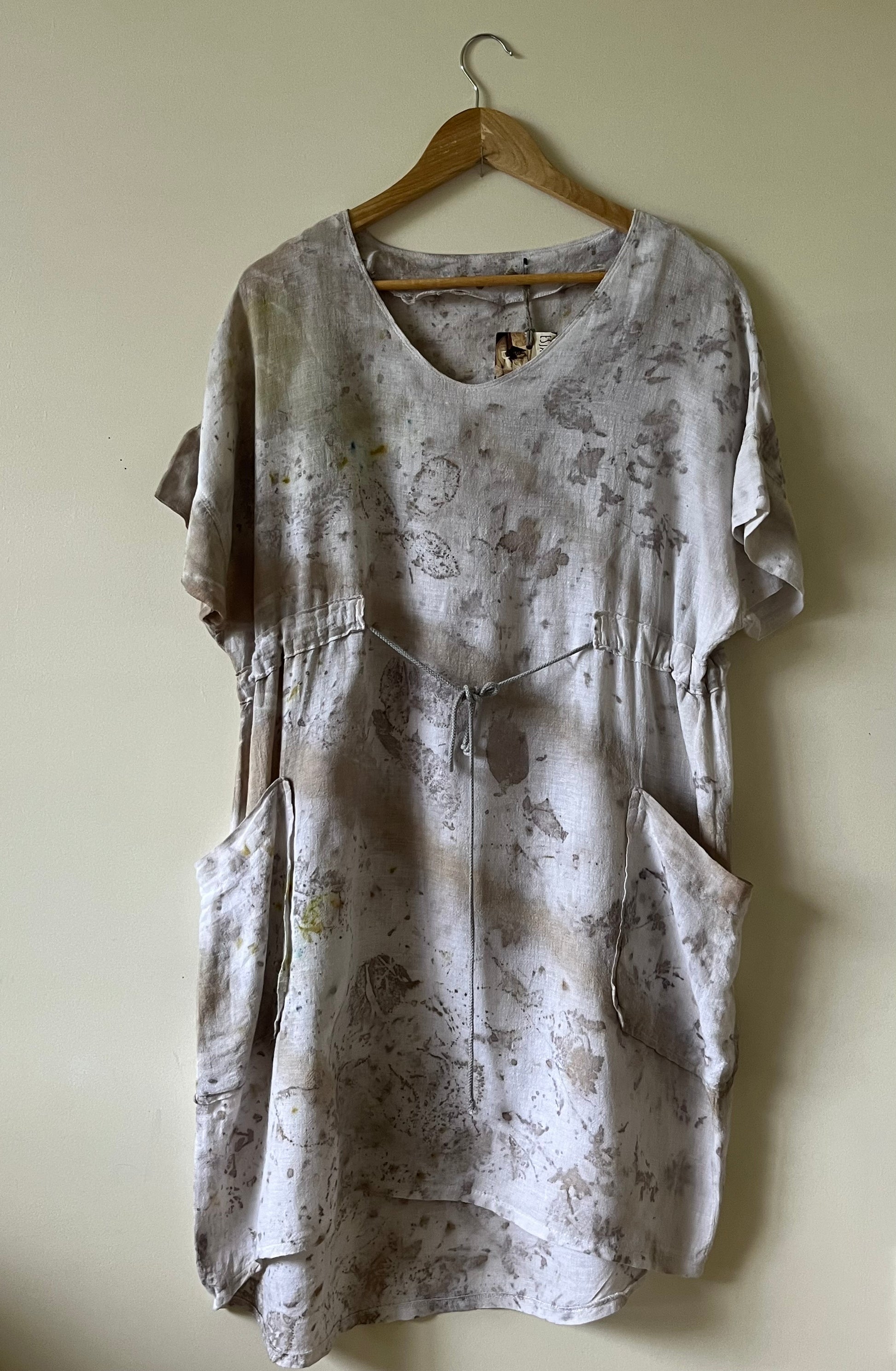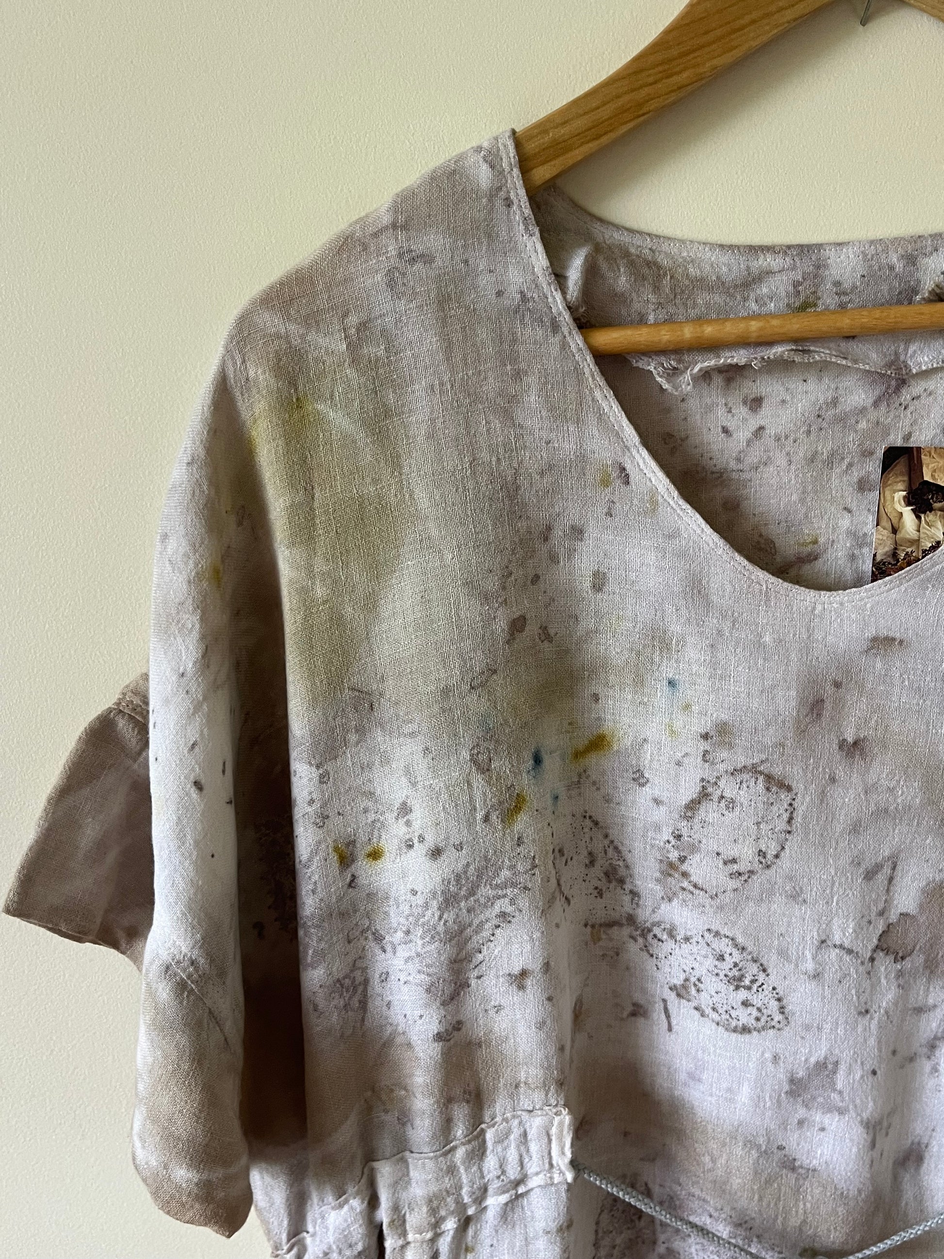This garment has been eco-printed and bundle-dyed using natural processes and plants.