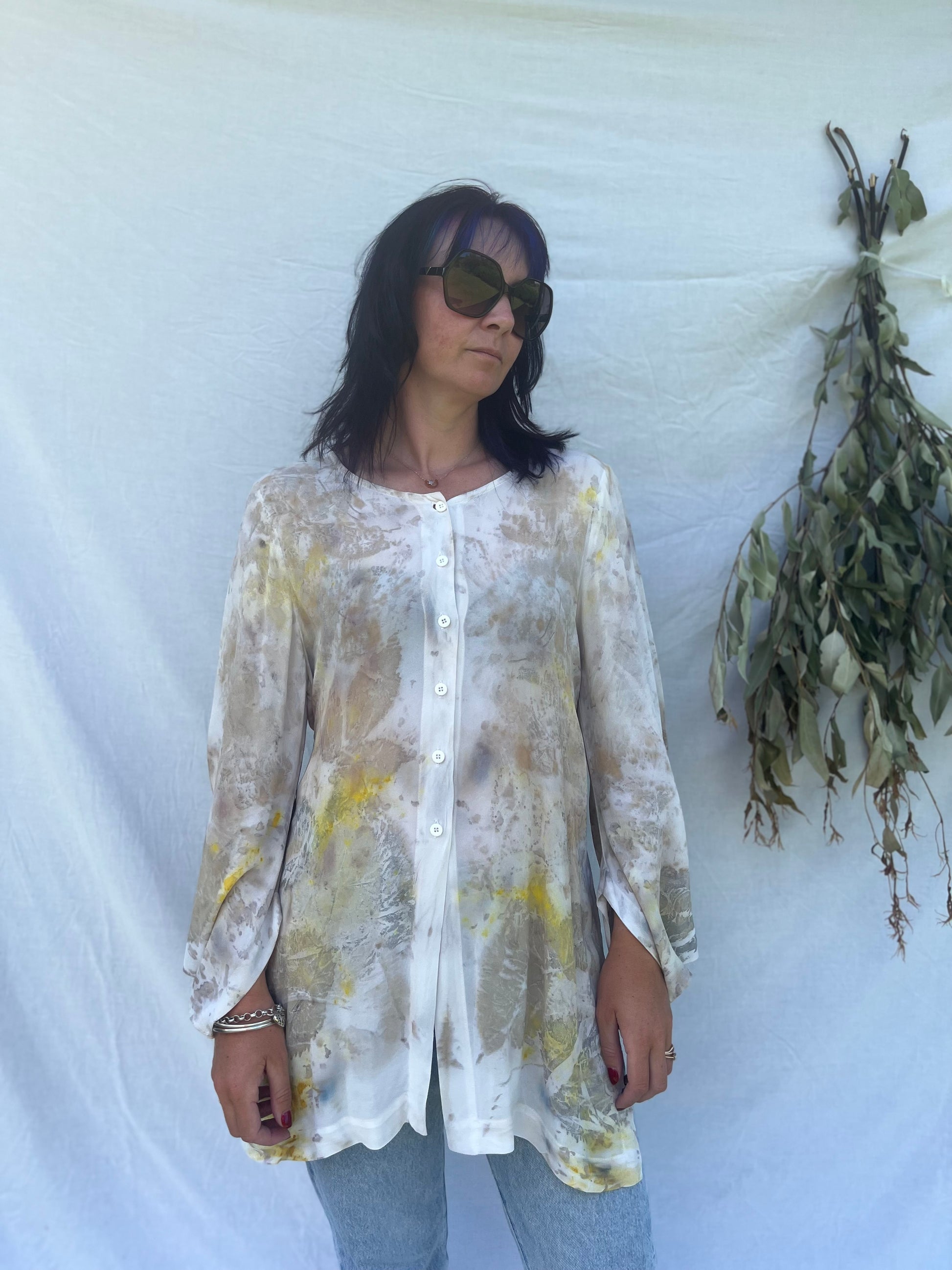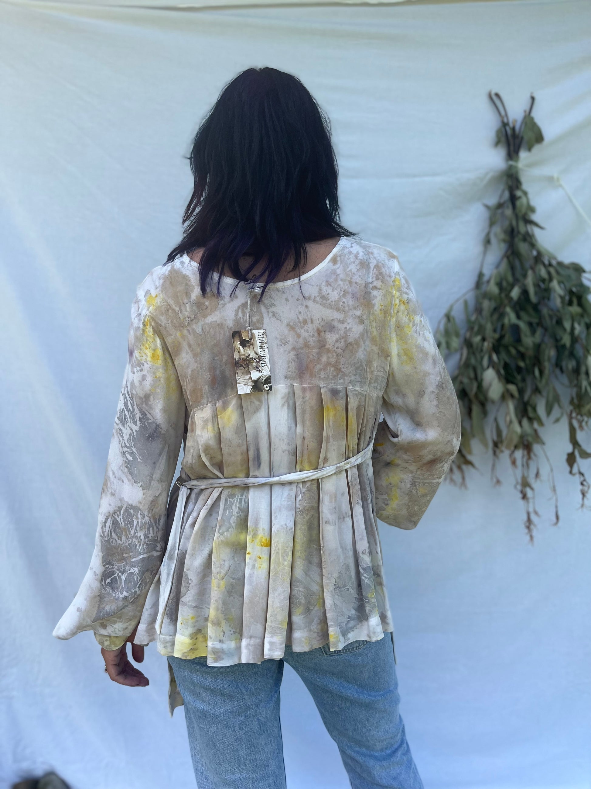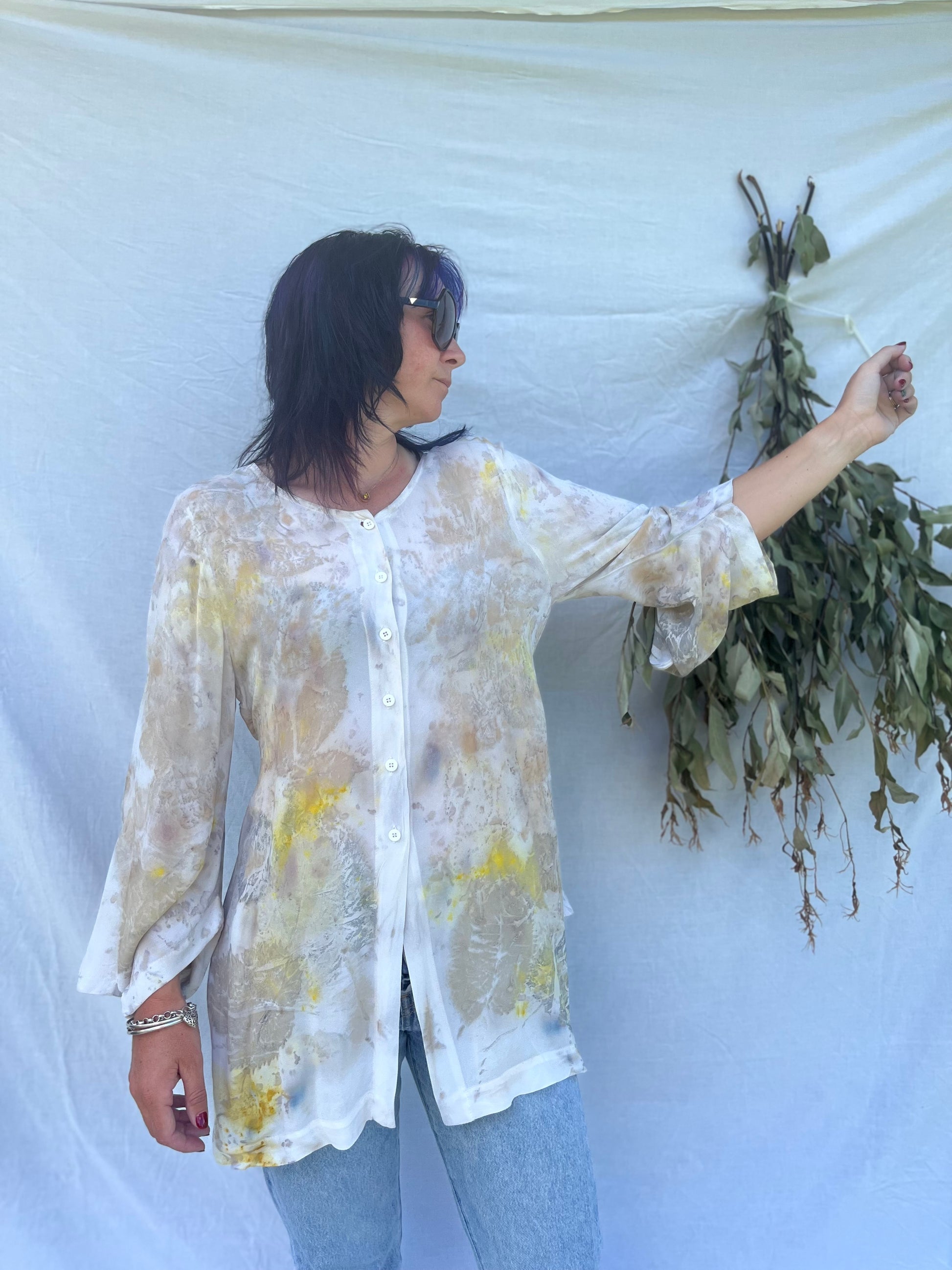 This garment has been eco-printed and bundle-dyed using natural processes and plants.
