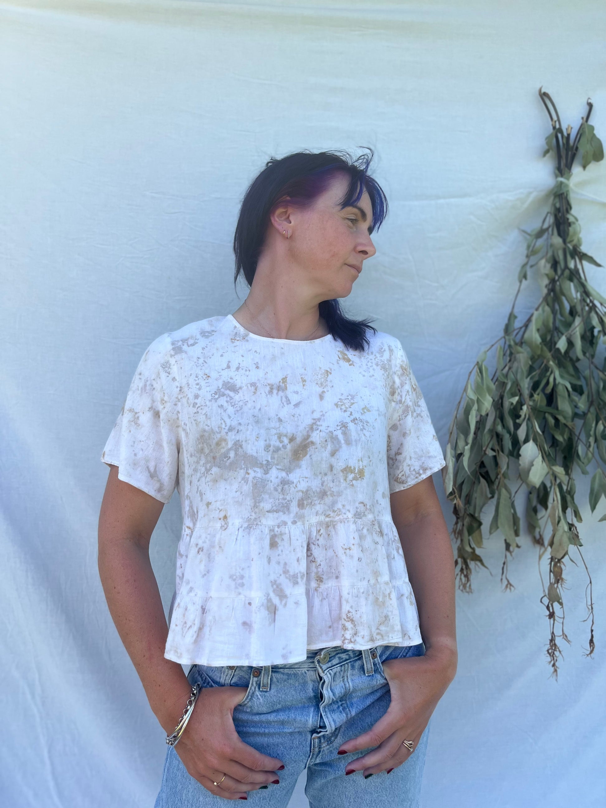 This garment has been eco-printed and bundle-dyed using natural processes and plants.