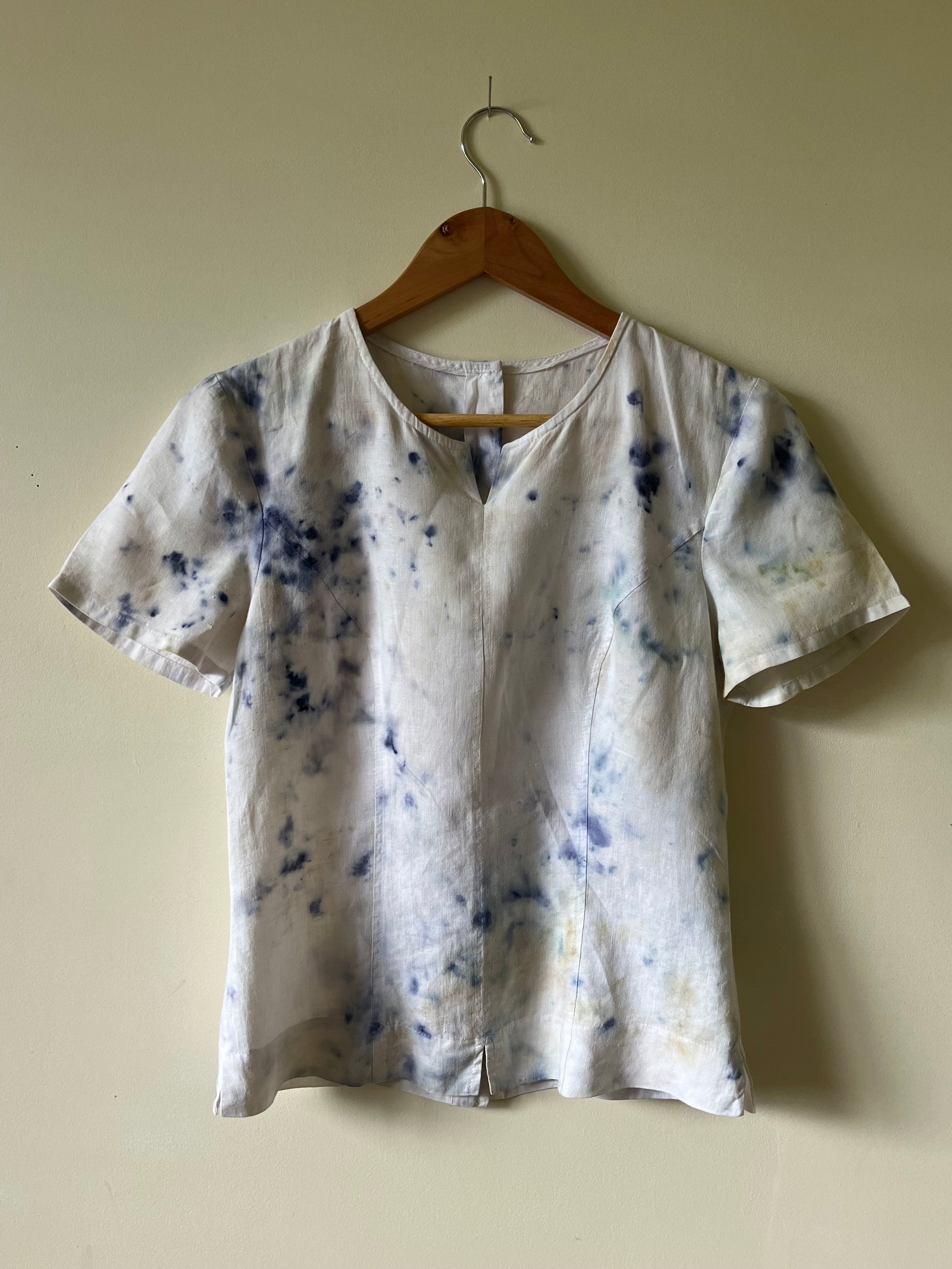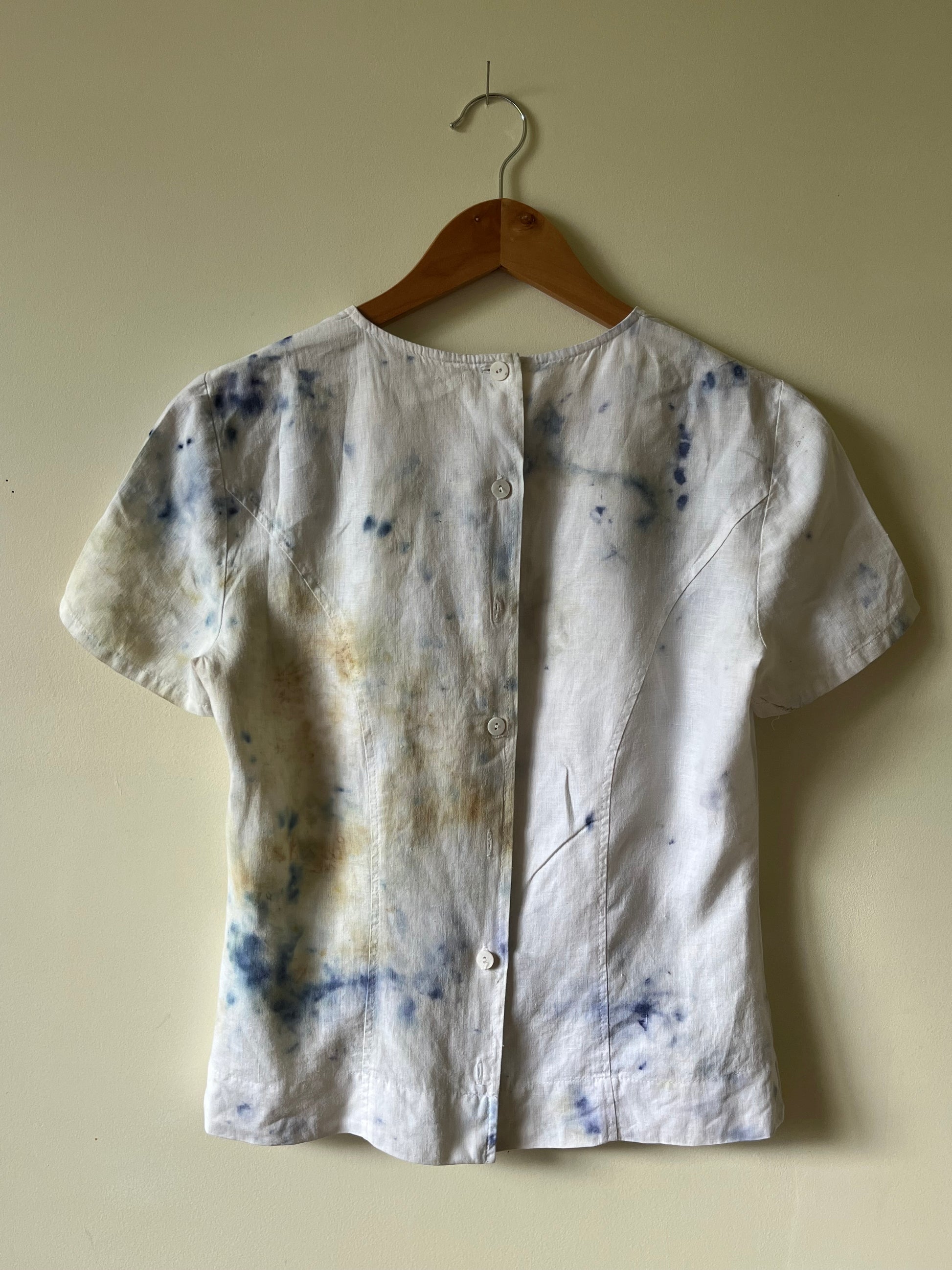 This garment has been eco-printed and bundle-dyed using natural processes and plants.