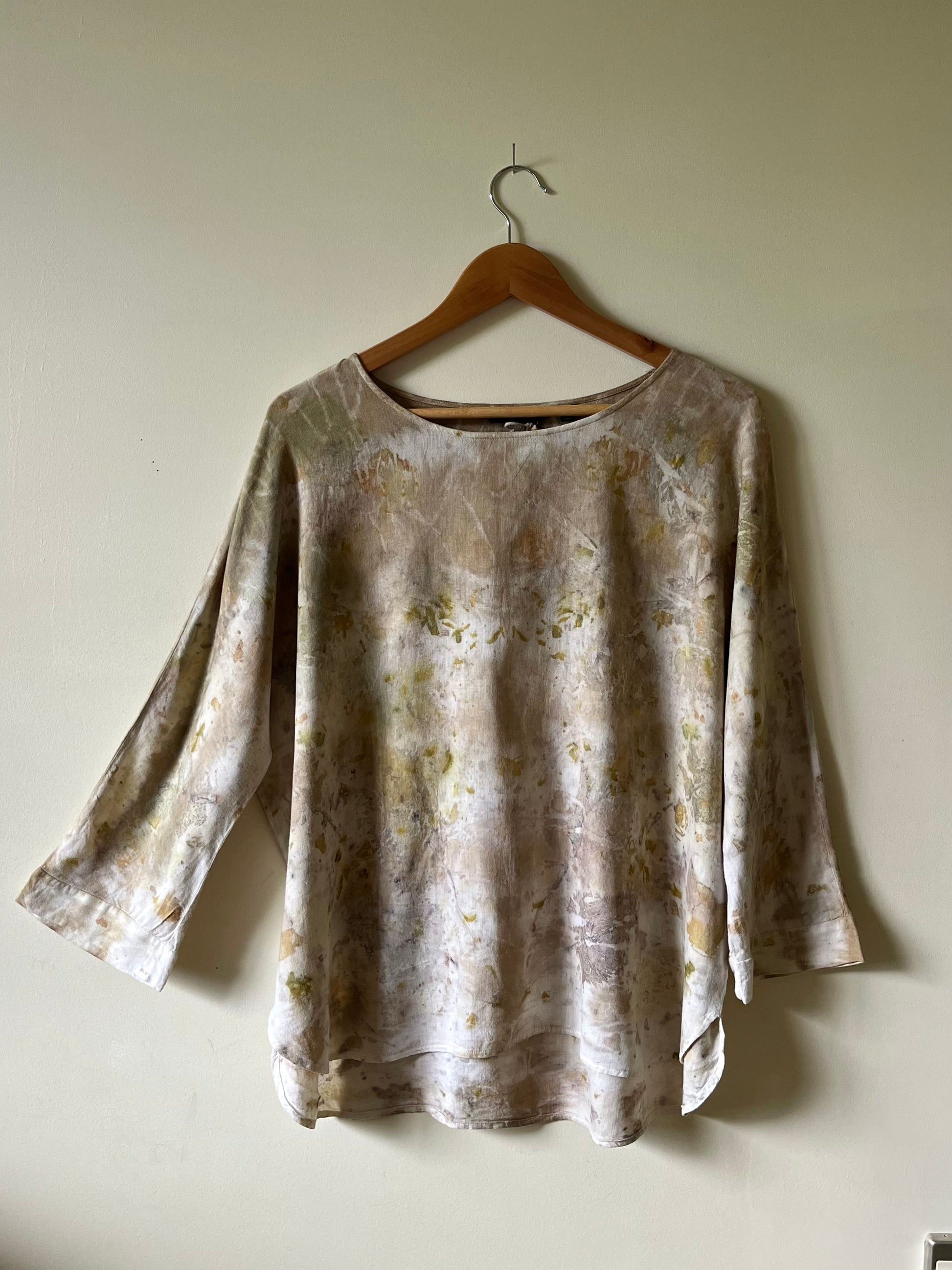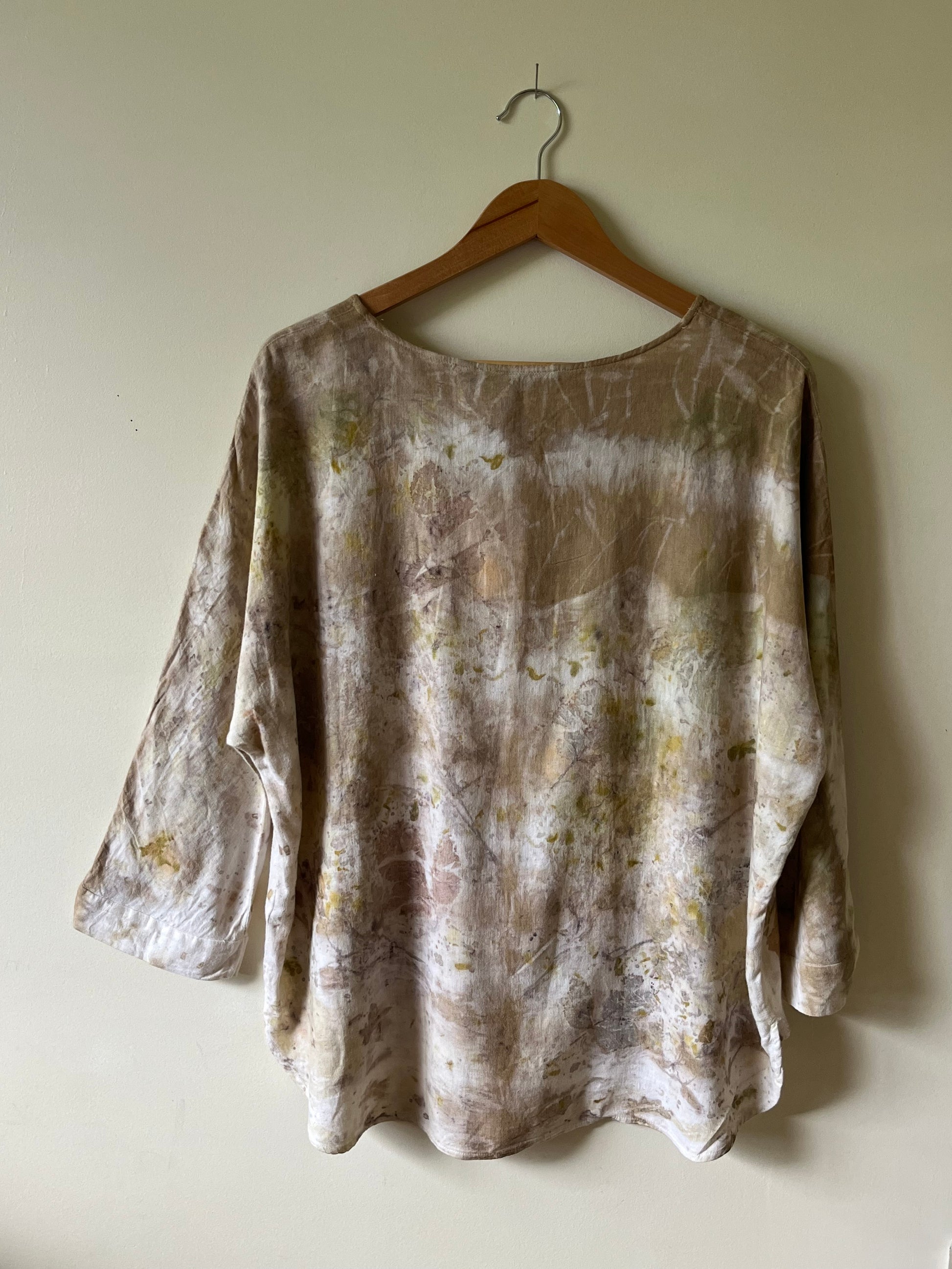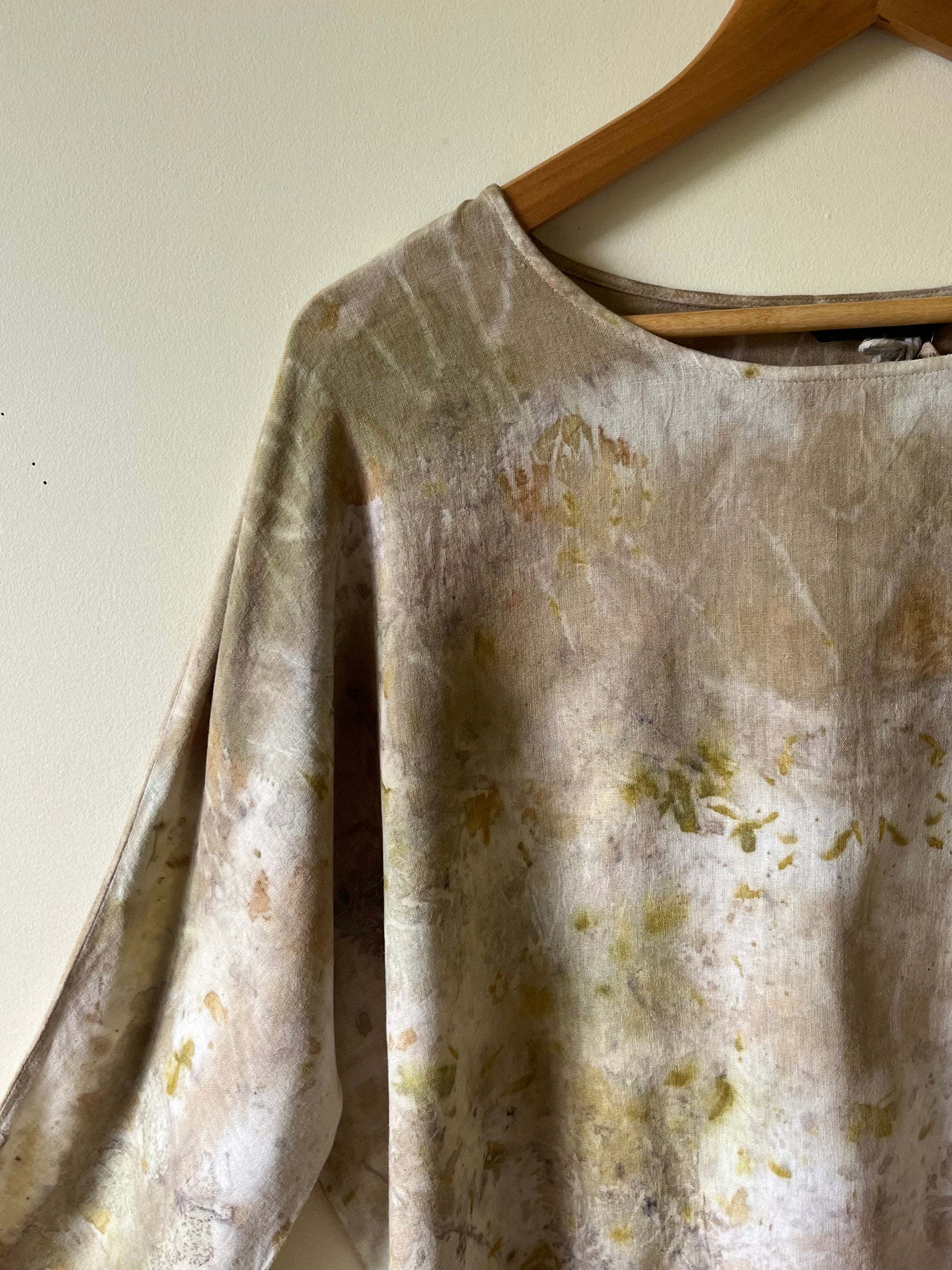 This garment has been eco-printed and bundle-dyed using natural processes and plants.