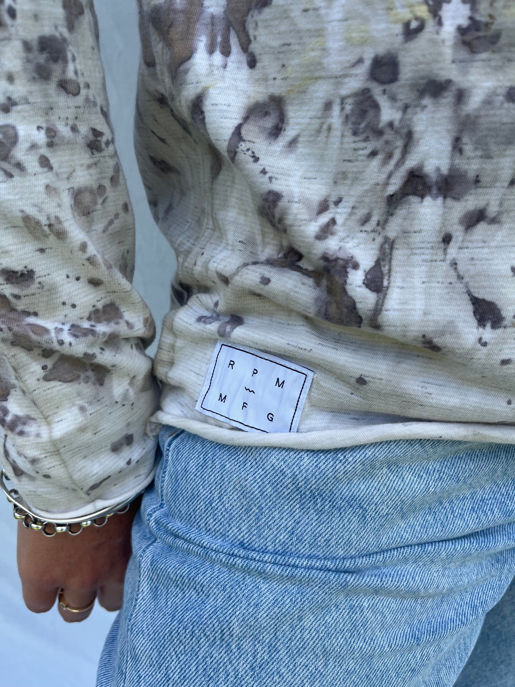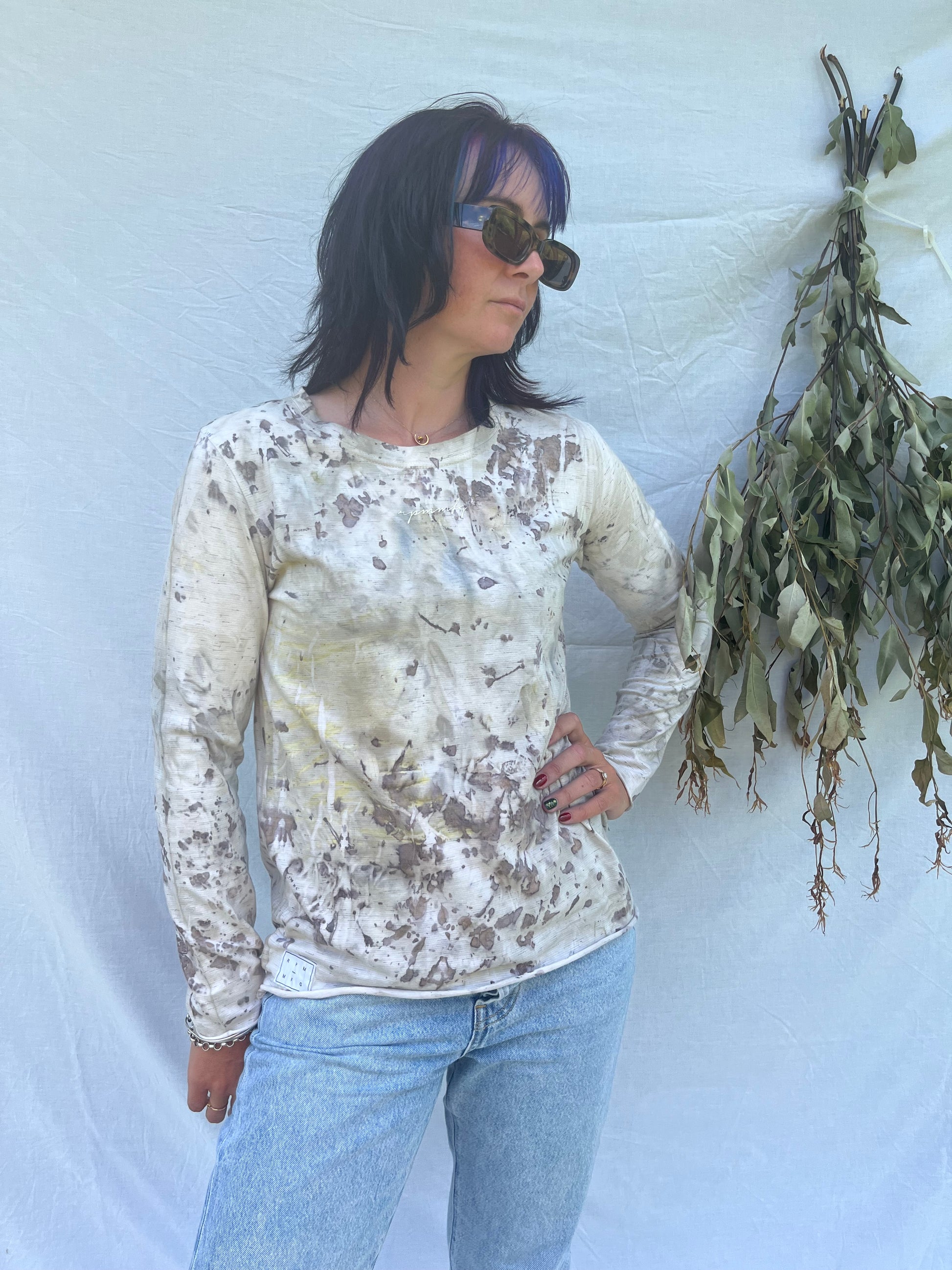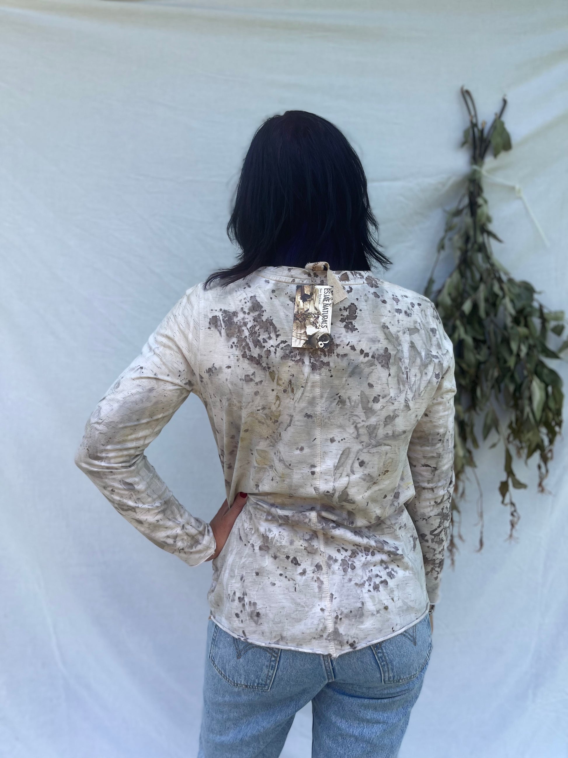 This garment has been eco-printed and bundle-dyed using natural processes and plants.