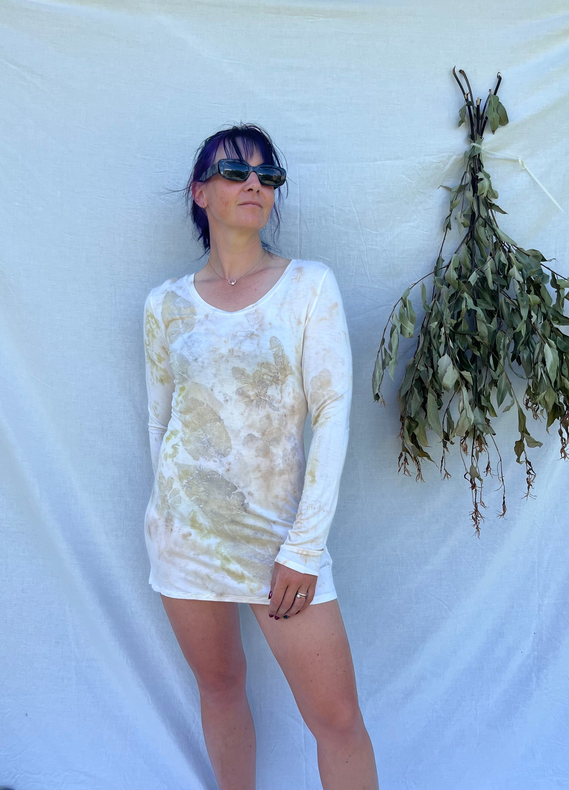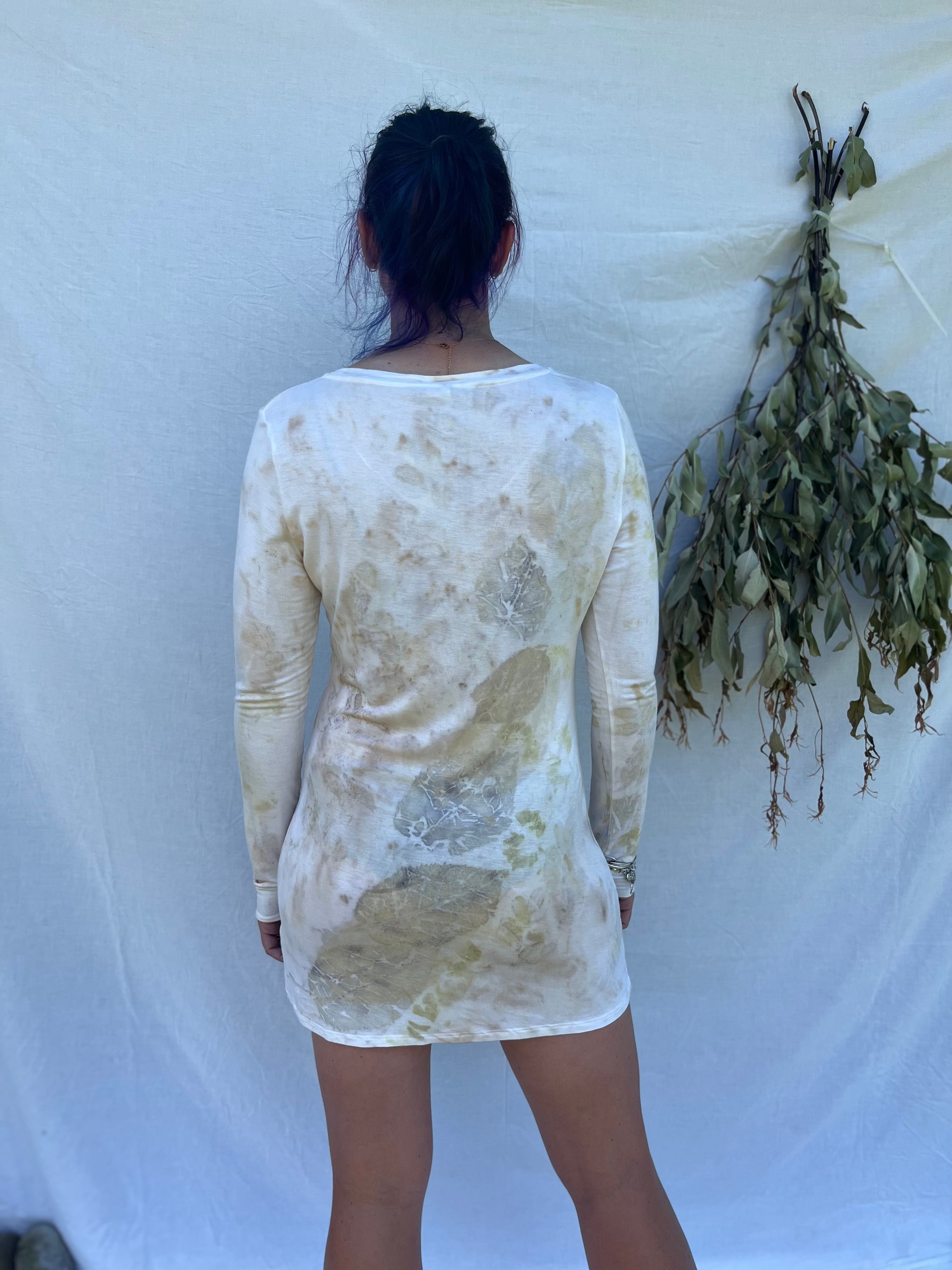 This garment has been eco-printed and bundle-dyed using natural processes and plants.