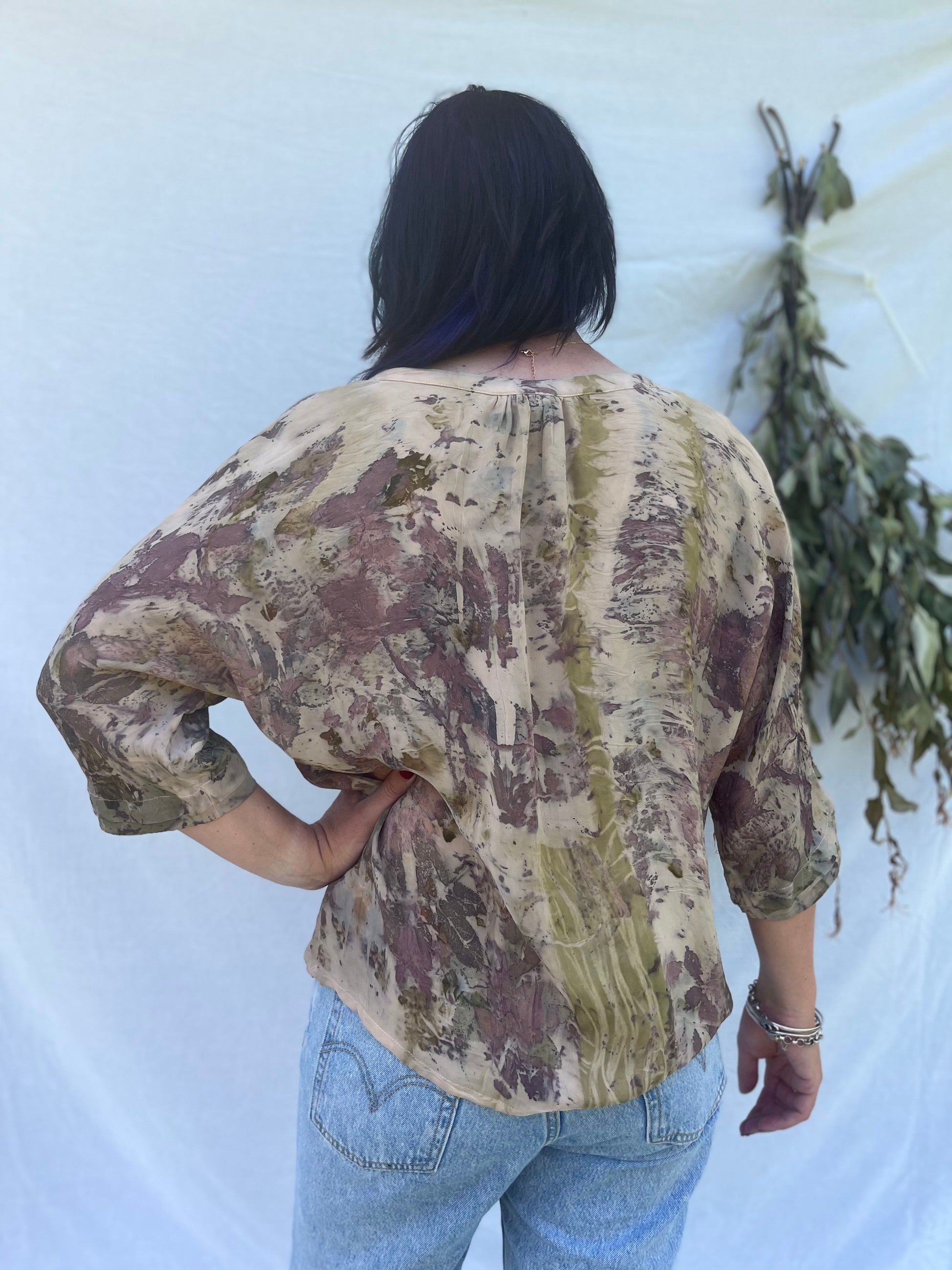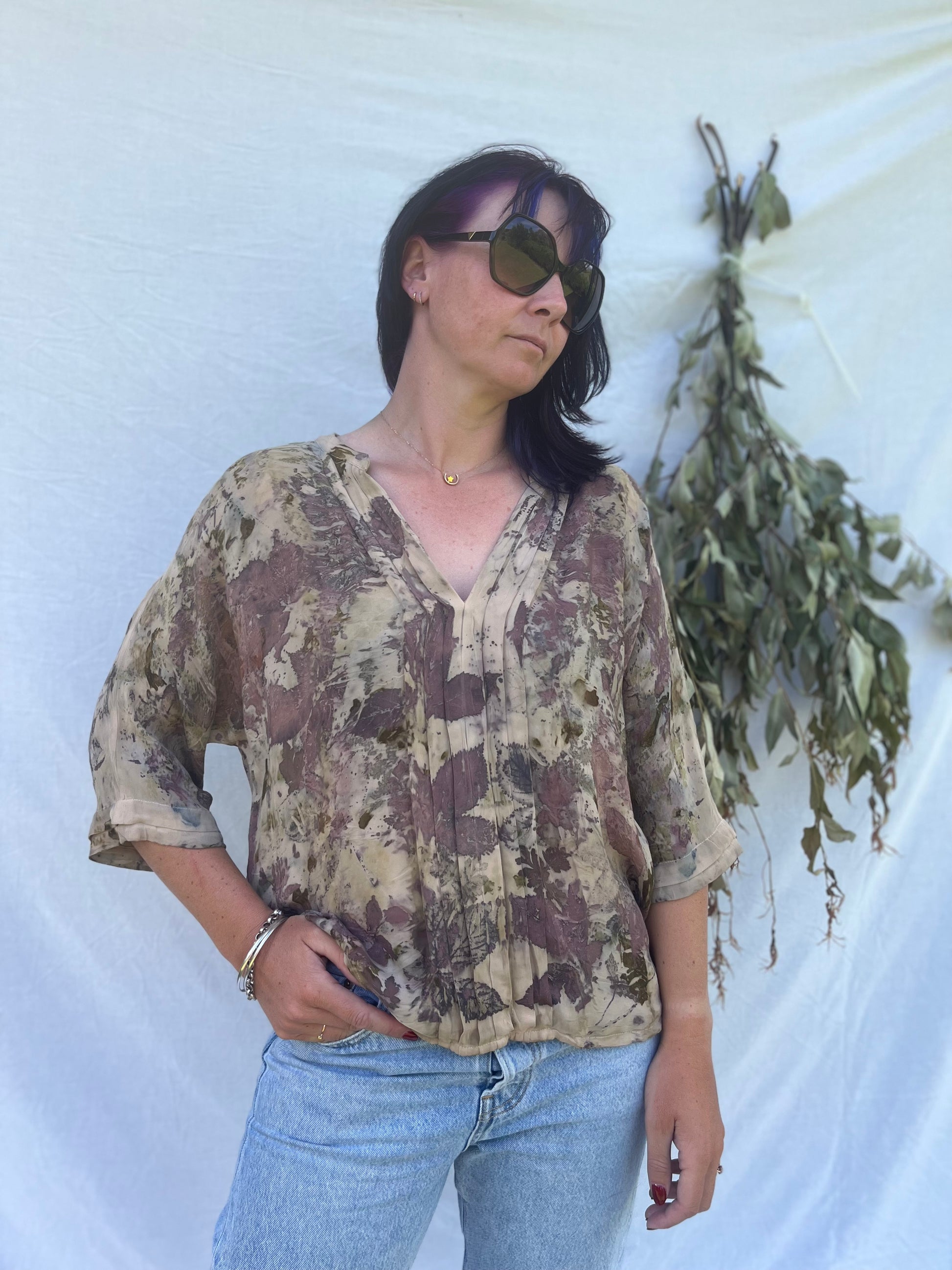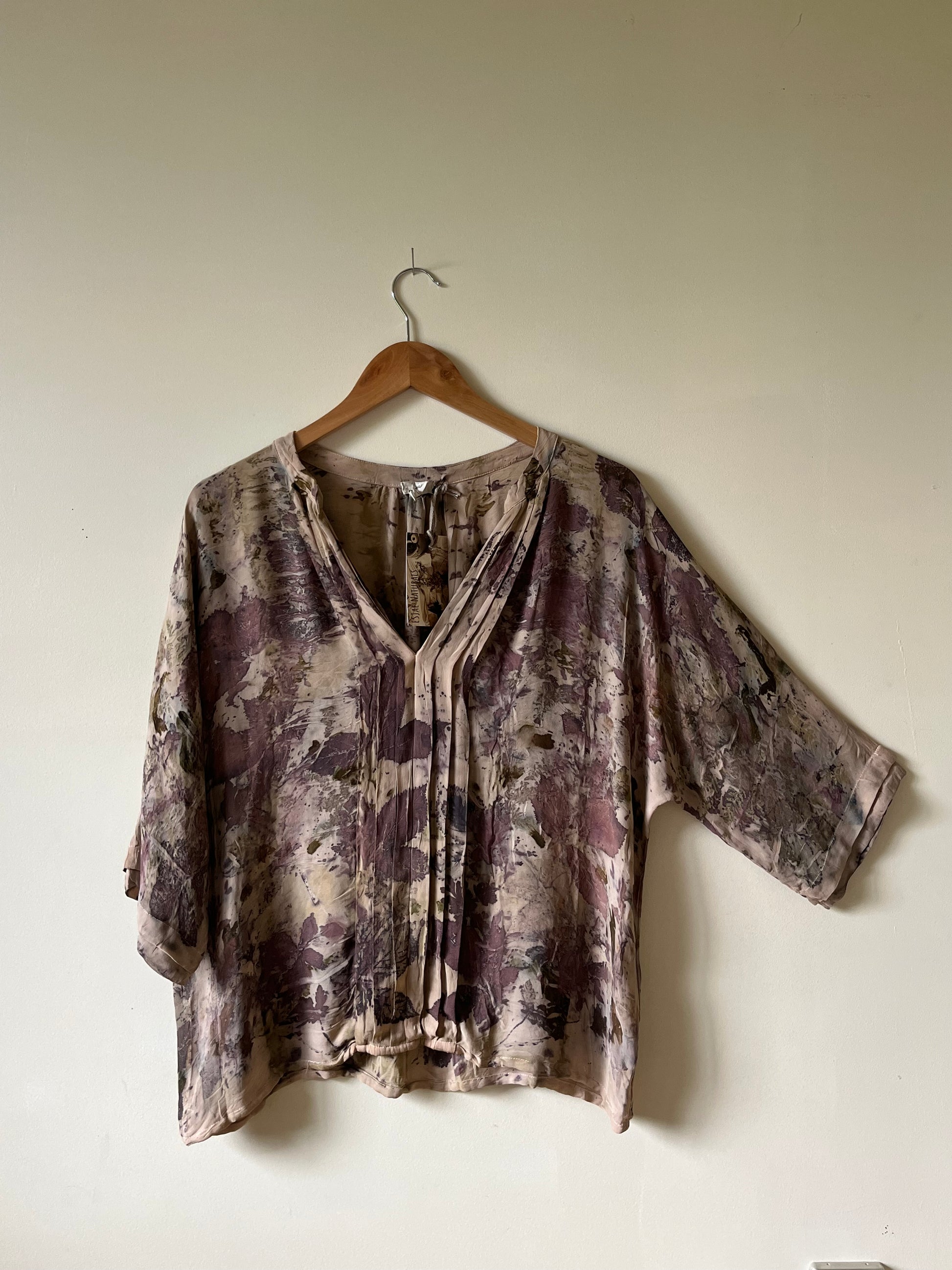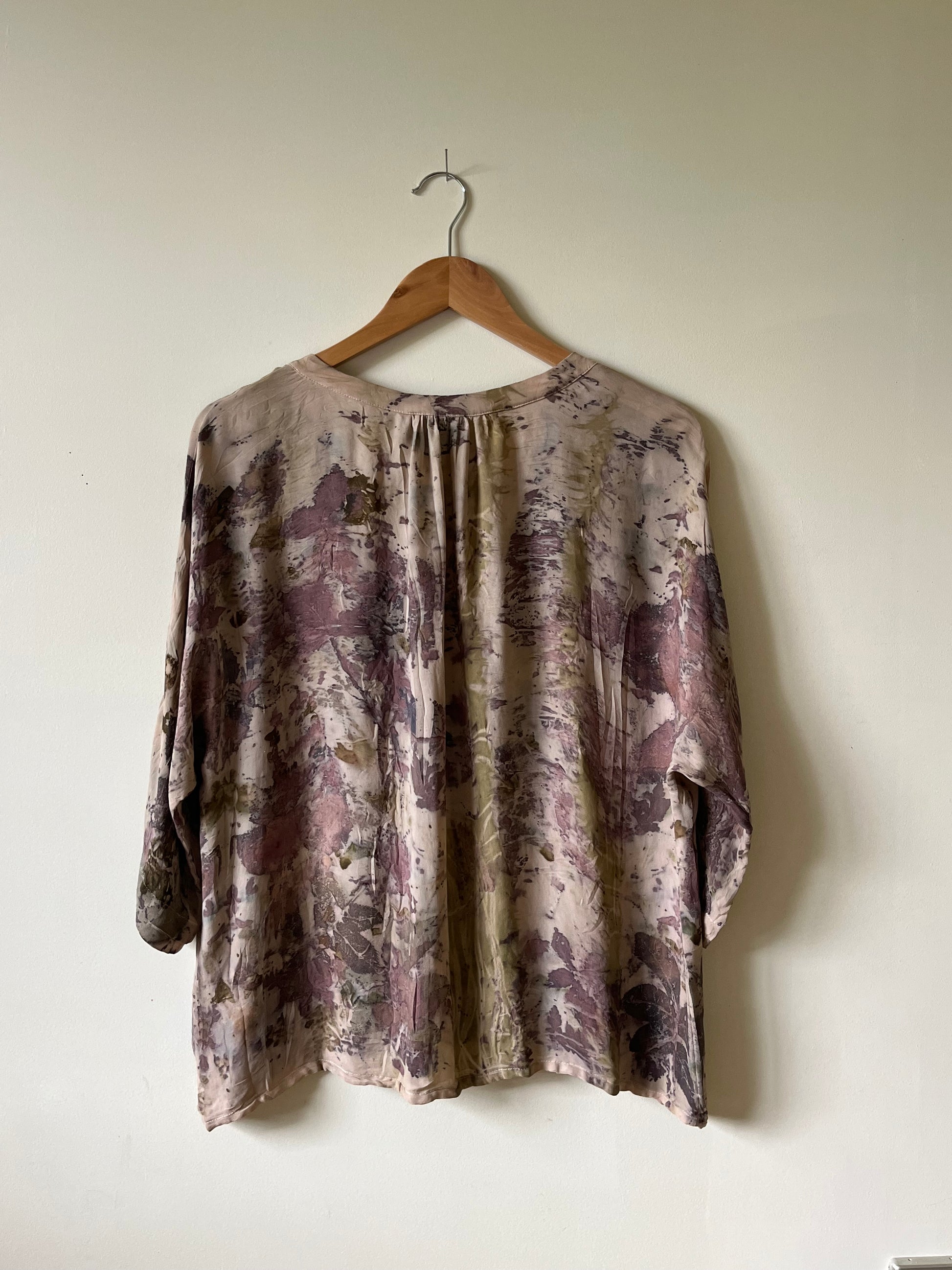 This garment has been eco-printed and bundle-dyed using natural processes and plants.