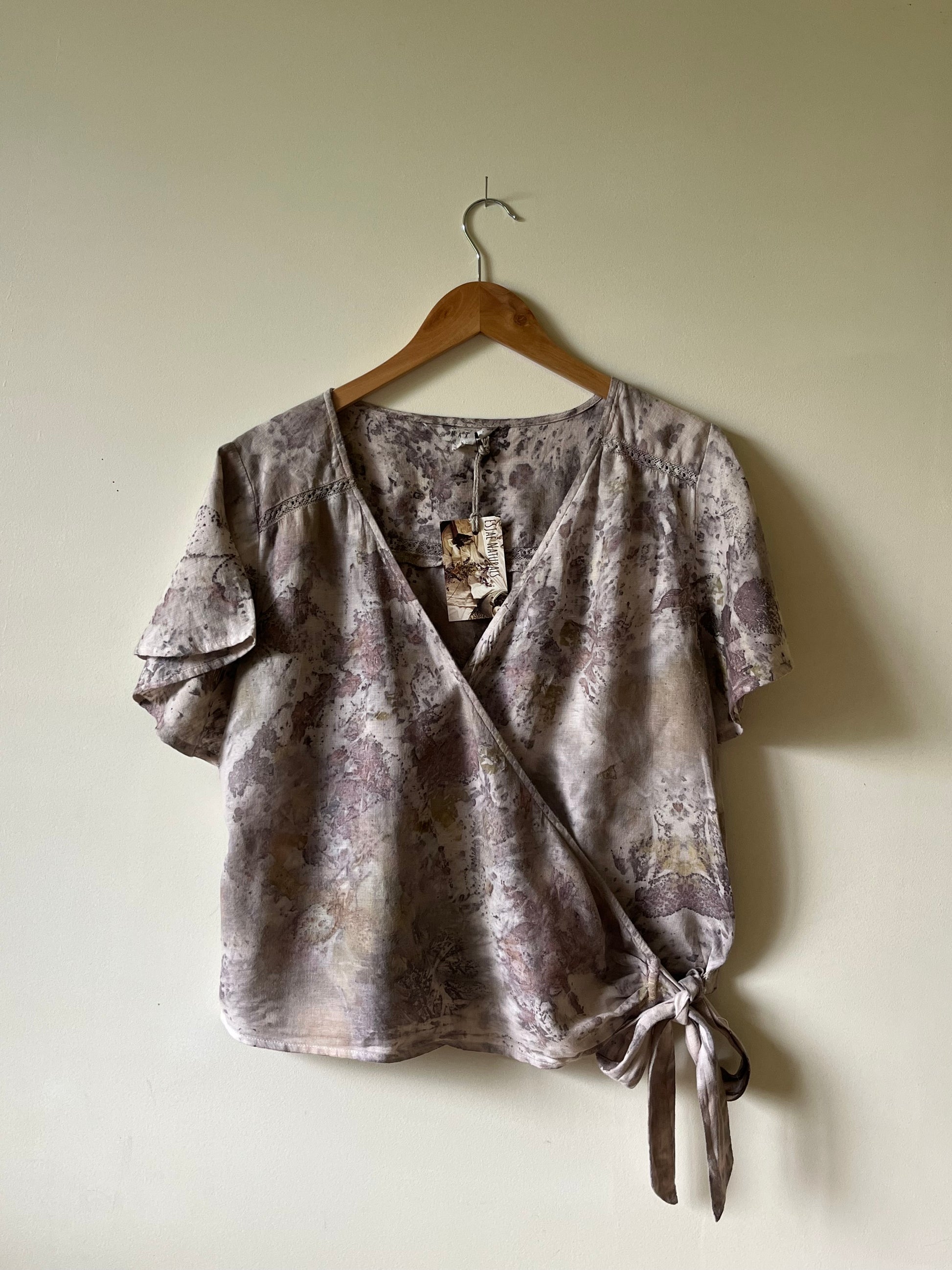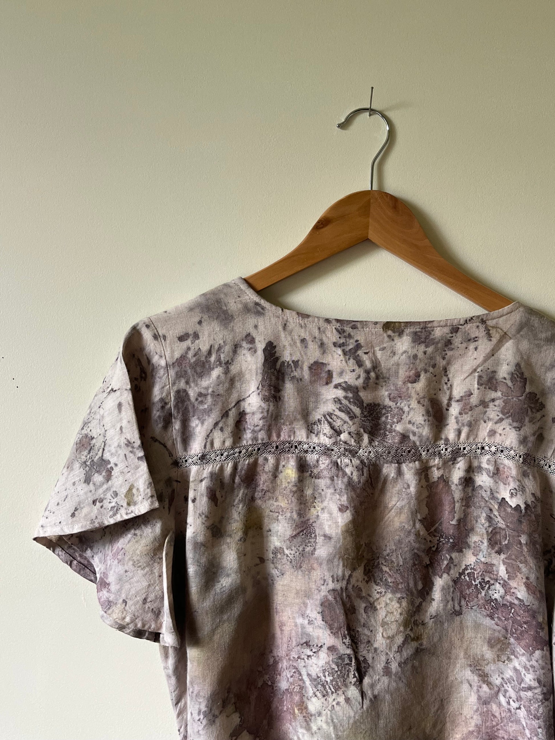 This garment has been eco-printed and bundle-dyed using natural processes and plants.